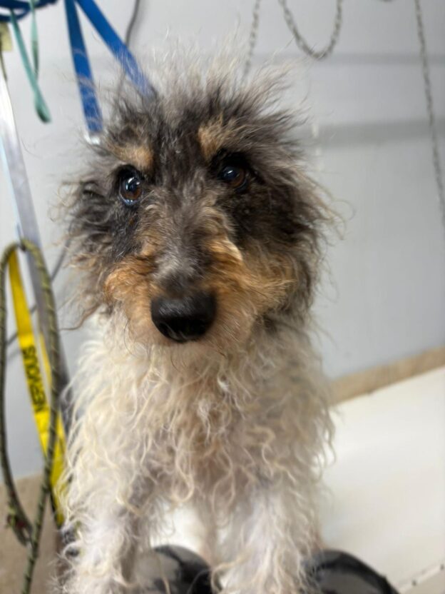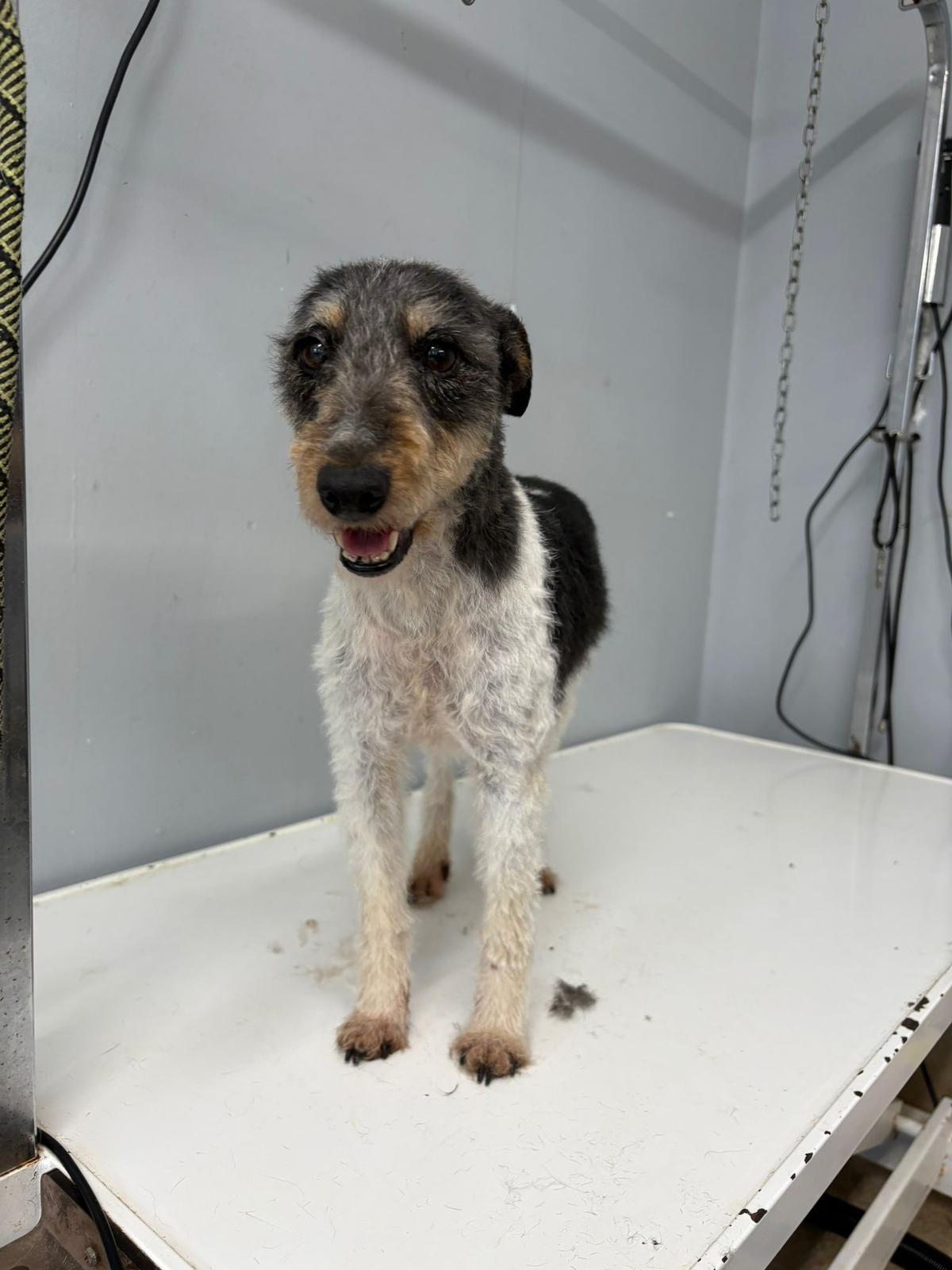 We were contacted by a volunteer – two fox terriers were abandoned near Salamanca – they were chained up in a barn – they have lived their lives on short chains and without the kindness or comfort they should have had.  We agreed to take them and change their lives – so through a lovely group of volunteers they were moved to kennels in Spain and to safety – they will shortly move to the UK.